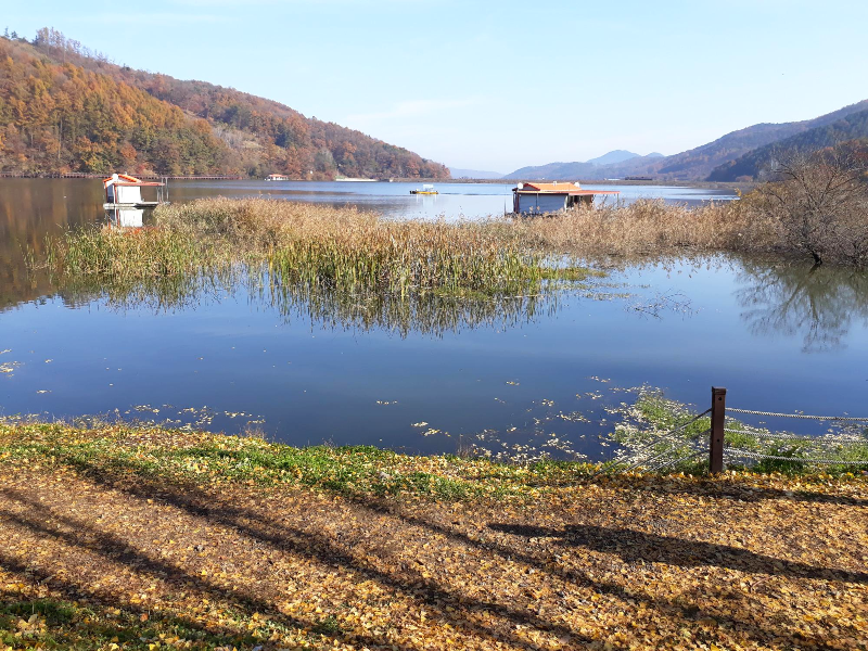 평화롭고 늦가을 분위기가 한창인 저수지를