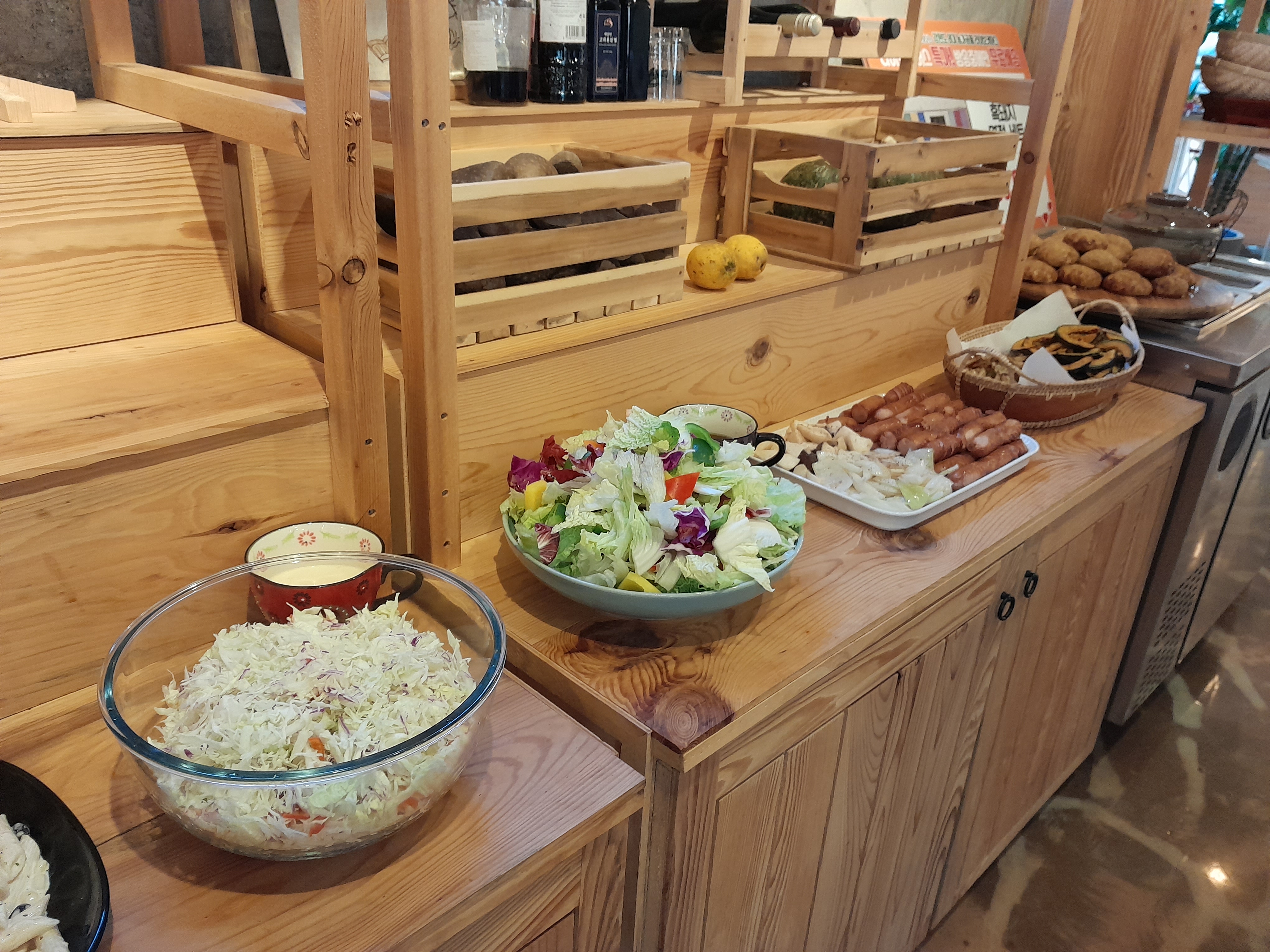 오잉크팜에서 준비한 샐러드와 소시지, 스테이크,